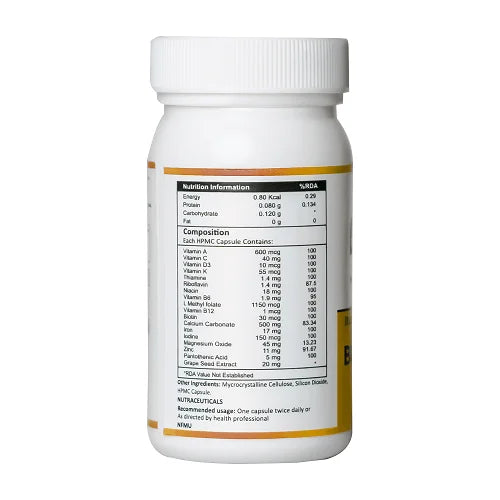 Vit A, C, D, B Complex, K, H, Calcium, Magnesium, Iron, Iodine, Zinc, L- Methyl Folate, Grape seed extract. (Important Ingredients)